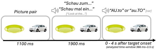 2019), children see displays of two pictures (e.g., a car and a baby) while hearing a spoken noun referring to one of both objects (the target, e.g., “Baby”). The disyllabic name of the target is either correctly stressed, i.e., with stress on the first syllable (“BA.by”), or it is incorrectly stressed, i.e., with stress on the second syllable (“ba.BY”).