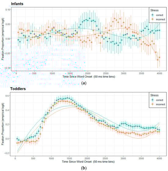 2019) results for 17-month-olds who also reported interactions between word stress and time terms: they interpreted a positive interaction of word stress and the linear time term as indicating that the looking behavior was steeper for correctly compared to incorrectly stressed words. Similarly, they interpreted the negative interaction of word stress and the quadratic time term as indicting less bend in the fixation curve for correctly compared to incorrectly stressed words. From that, the authors concluded that the looking behavior was faster and increased through the whole trial for correctly compared to incorrectly stressed words. The tested infants and toddlers of our study showed the same pattern of results, except that toddlers—but not infants—additionally showed an effect of stress on the intercept.