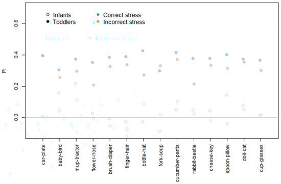 Figure 5. Here, we plotted the mean PIs per display for correctly stressed and incorrectly stressed trials and for infants and toddlers, separately. For nearly all item pairs, the PI was higher when the target’s name was correctly stressed in comparison to when it was incorrectly stressed (except for the pair fork–soup for both groups and the pairs bottle–hat and cucumber–pants for infants).