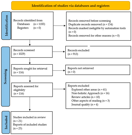 The terms reported in the search strategy were explored in 11 databases, provided in Table 2. Searching through these databases returned a total of 1183 sources. However, after de-duplication and removing 154 reports, 1029 papers were left for abstract screening, which led us to remove 913 more studies as these did not seem to focus specifically on the relationship between translanguaging and L2 reading. This process left 116 reports to be assessed for eligibility for the full-text screening.