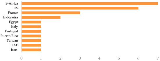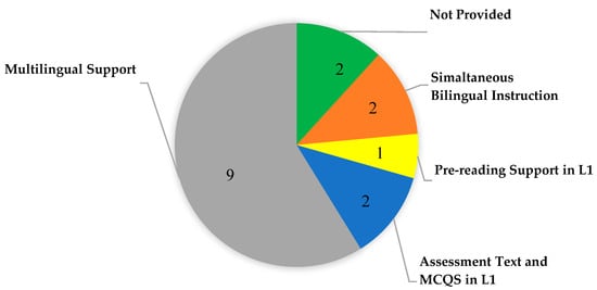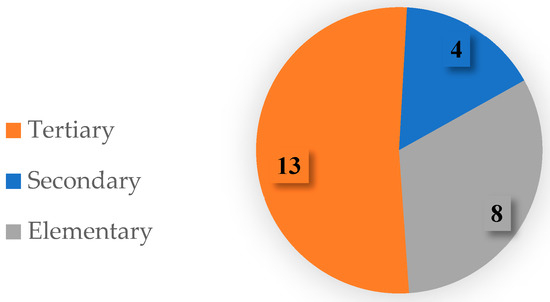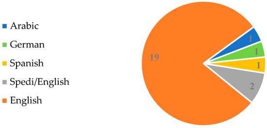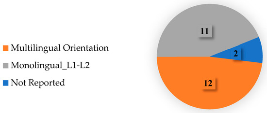 Since these studies met the inclusion criteria of the current research paper, these were further analyzed for the contextual, substantive, and methodological variables. For the contextual variables, five major aspects were coded from the 25 samples extracted from the corpus. These variables included information about settings in which a study was conducted, the name of the country, the translanguaging orientation, the approach to the target-language development—L2 or multiple languages, and educational level of the participants in these samples. Details about the contextual variables are displayed in Figure 2, Figure 3, Figure 4, Figure 5 and Figure 6.