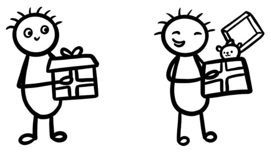 Illustration from PEVT, adapted item from (), depicting the emotion “Joy” supplemented by a short excerpt: ‘Wow! That’s a great present!’ ().