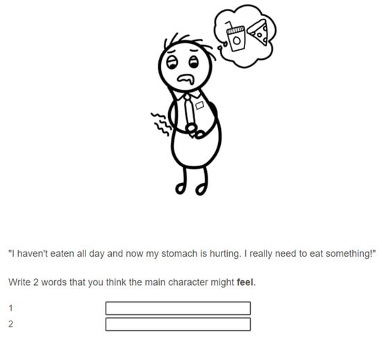 Each emotion word was then illustrated to depict a protagonist within a situated context to mimic an emotional episode, accompanied by a short sentence of the protagonist’s thoughts (Figure 2). Each item was presented in a random order on Qualtrics with the following instructions: “Write 2 words that you think the main character might feel”.