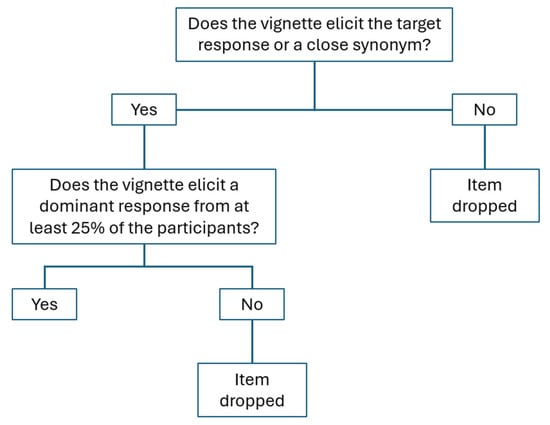 To improve the construct validity of this test, the flowchart (Figure 3) illustrates the process to remove underperforming items before proceeding to the next phase of analysis. Setting a naming agreement threshold at 25% (i.e., proportion of participant providing the same headword as dominant response) ensures that the vocabulary items included in the assessment are representative enough of the population’s knowledge. Lower frequency words that fall below this threshold may not be sufficiently known or commonly used among a diverse group of learners. The threshold helps filter out obscure items that might otherwise skew the results of the test. A 25% threshold strikes a balance between challenge and accessibility. This ensures that the test is neither too easy (where nearly everyone knows all the words) nor too difficult (where most words are too obscure). An achievable but non-trivial threshold helps maintain the test’s integrity as an appropriate measure of vocabulary knowledge across a variety of proficiency levels. Additionally, by setting this cut-off, we improve content validity by ensuring that the words assessed are genuinely within the emotional range and understanding of a significant portion of the demographic. The threshold suggests a certain level of commonality in vocabulary recognition, which could contribute to test reliability by including words commonly recognised, understood, and used amongst varied test groups. Following those criteria, 27 items were selected for the next phase of analysis.