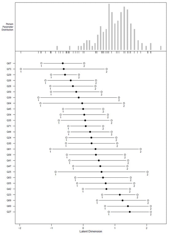 In Figure 5, all items appeared to be relatively evenly distributed across the latent dimension, ranging between −2 and +2. The majority of participants in this study have an above-average ability, centred just above the 0 mark. There were no noticeable flooring or ceiling effects in this model. This indicates that the items are neither too easy nor too difficult for the respondents.