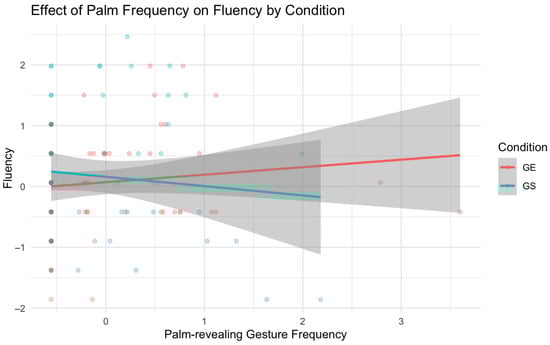 Interaction between palm-revealing gesture frequency and condition (gesture-encouraged vs. gesture-spontaneous) on fluency scores. Regression lines represent the estimated relationship between palm-revealing gesture frequency and fluency within each condition, with shaded areas indicating 95% confidence intervals. Neither simple slope was statistically significant. Dots represent individual participants’ data points. The different colors indicate the two experimental conditions (gesture-encouraged in red and gesture-spontaneous in teal). Variations in color shades occur because some dots (data points) overlap.