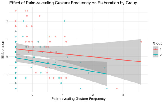 Effect of palm-revealing gesture frequency on elaboration by group. Shaded areas represent 95% confidence intervals. Dots represent individual participants’ data points (Group 1 participants in red and Group 2 participants in teal); variations in color shades occur because some dots (data points) overlap.