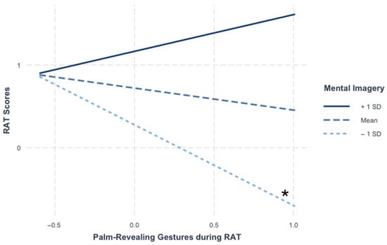 Similar to the within-subject analysis, we found an interaction effect between beat gestures and mental imagery irrespective of group, F(1,129) = 5.55, p = 0.02, η2 = 0.04. Simple slope analysis revealed that only the slope for high mental imagery (+1 SD) individuals was significant, b = −0.33, SE = 0.13, t(129) = −2.51, p = 0.013, irrespective of the gesture condition. Individuals with high mental imagery performed worse on the RAT when using beat gestures.