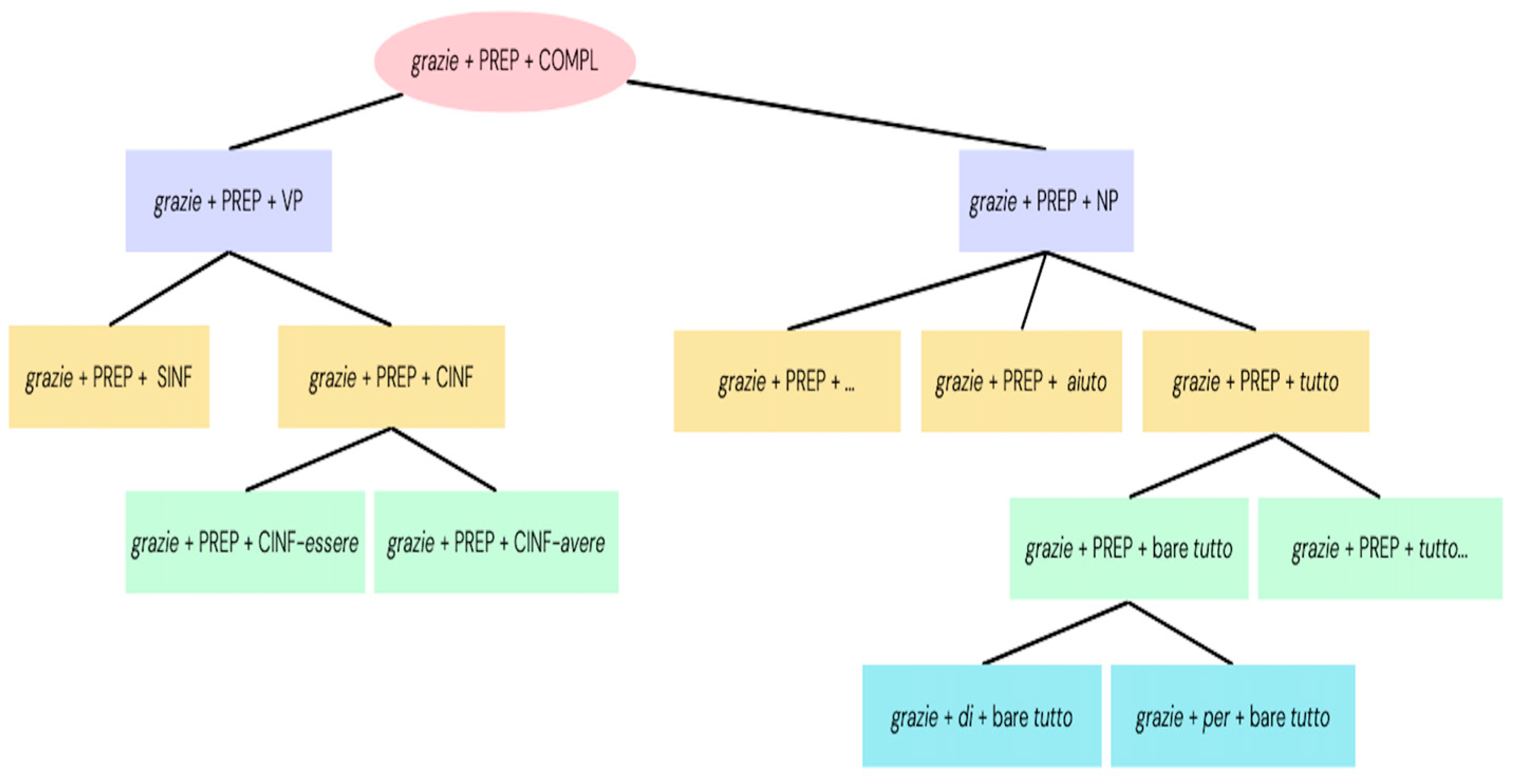 | 5 | The CQL query used was: [word=“grazie”][word=“a|anche|ancora|davvero|di|infinite|invece|mille|una”]{0,1} [word=“a|buon|cuore|dio|Dio|nuovo|sentito|te|tutte|tutti|tutto|vero|voi|una|volta”]{0,1} [word=“ancora|cuore|te|tutte|tutti|voi|volta”]{0,1}[word=“ancora|voi”]{0,1}[lemma=“di|del|della|per”] within <s/>. This search, while technically non-exhaustive, strikes a balance between precision and recall by avoiding excessive false positives (in the hundreds of thousands for a corpus this size) yet capturing the vast majority of intervening material. Specifying the lemmas del and della yielded degli, dei, del, dell’, della, delle, and dello. A filter was then applied to rule out cases of grazie a ‘thanks to’ plus partitive uses of forms of di (e.g., in buona salute grazie a dello sport, è possibile grazie a degli strumenti, etc.). |