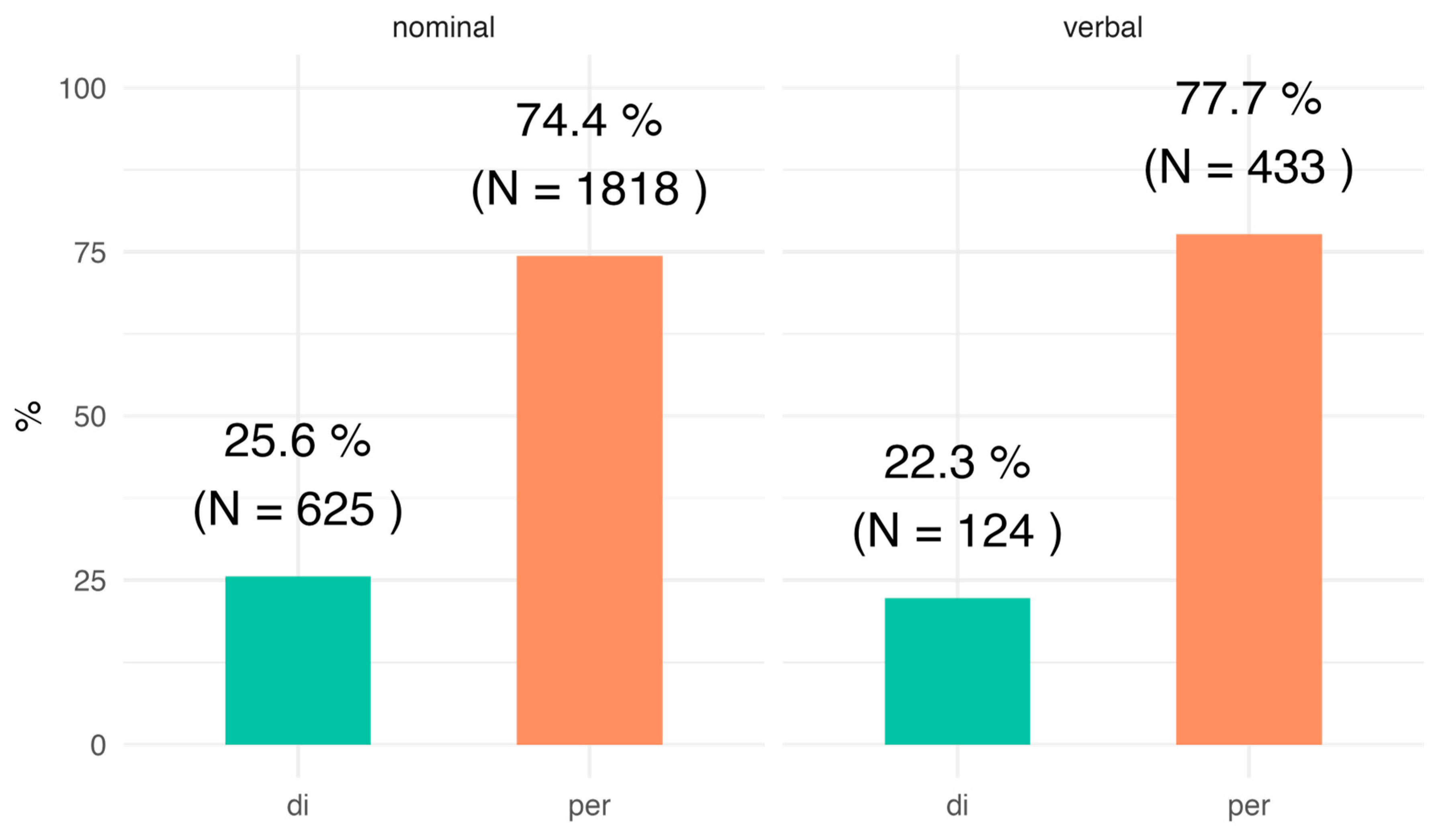 | 2 | Viola (2017) also examines ringraziare di/per in these corpora and indeed treats grazie/ringraziare as a single construction at various points throughout the study. However, grazie and ringraziare have clear syntactic and argument structure differences that distinguish them as separate constructions. For example, whereas grazie is nominal, ringraziare is verbal and licenses a direct object (i.e., the person thanked) which often appears between the verb and the prepositional complement. Another motivation for examining the constructions separately is seen in Viola’s (2017, p. 379) finding that significant differences between di and per emerged centuries earlier for ringraziare than for grazie. Thus, I will not address ringraziare here, but a detailed exploration of its preposition selection behavior is an important future direction. |