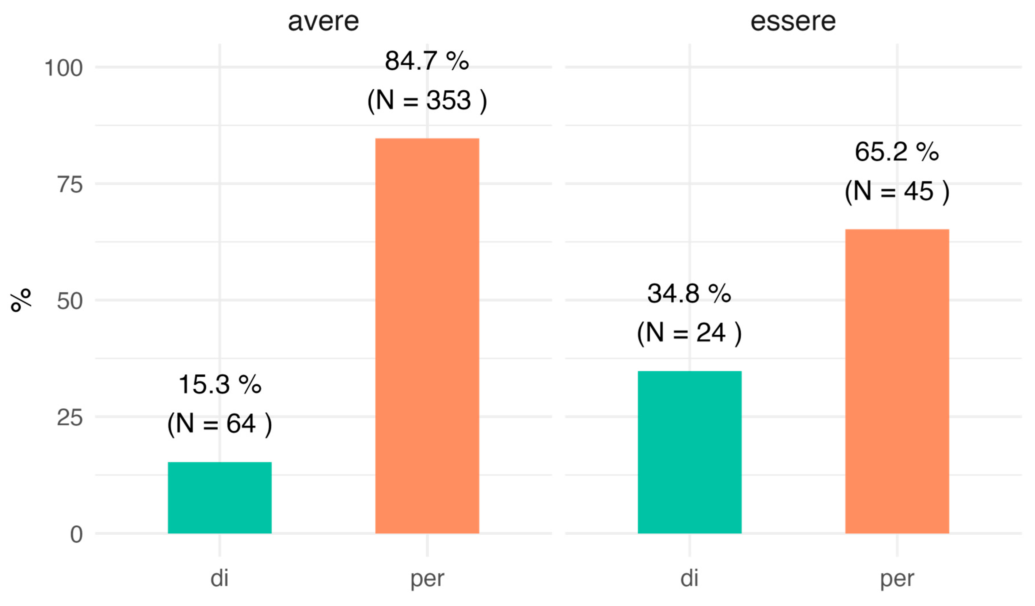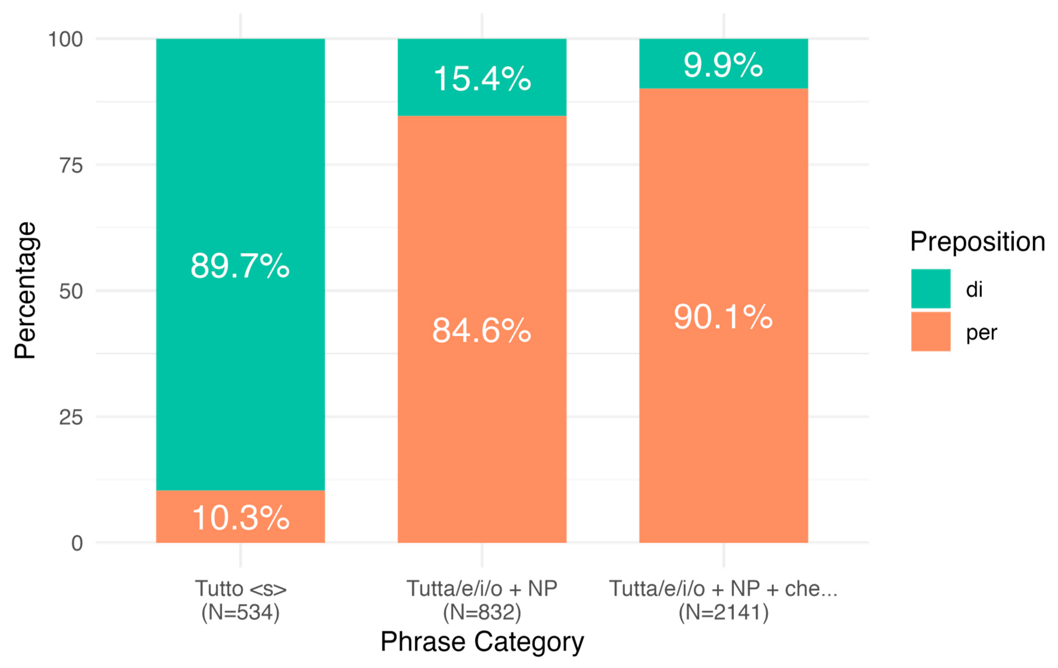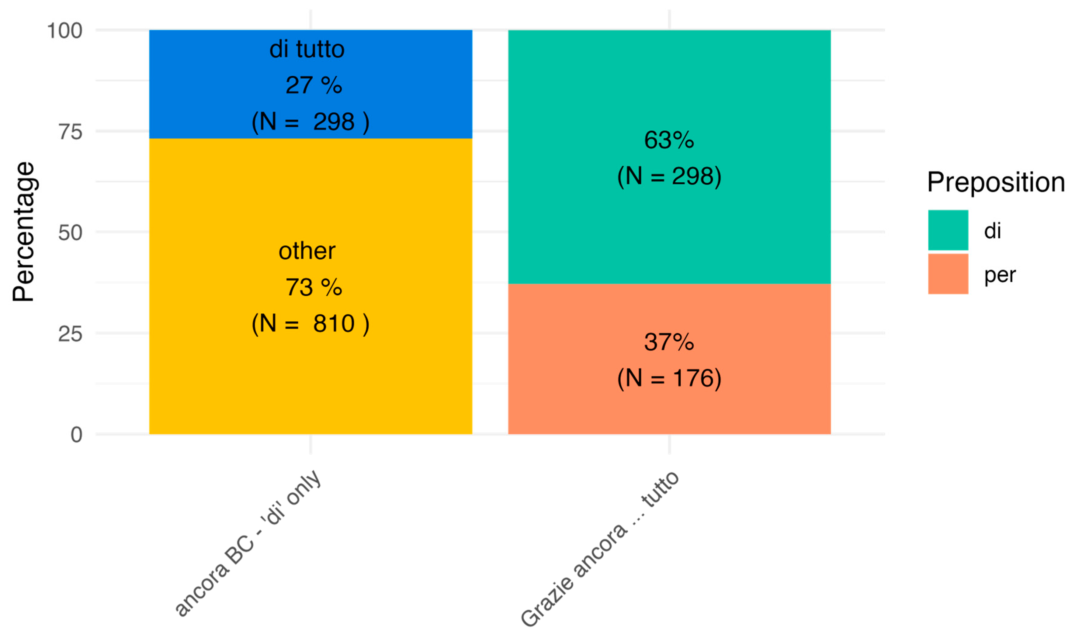 - RQ3: To what extent do micro-constructions within the larger grazie di/per construction (e.g., grazie ___ tutto, grazie ____ + compound infinitive with avere/essere, etc.) differ in their preposition selection behavior from one another and/or the overall pattern?