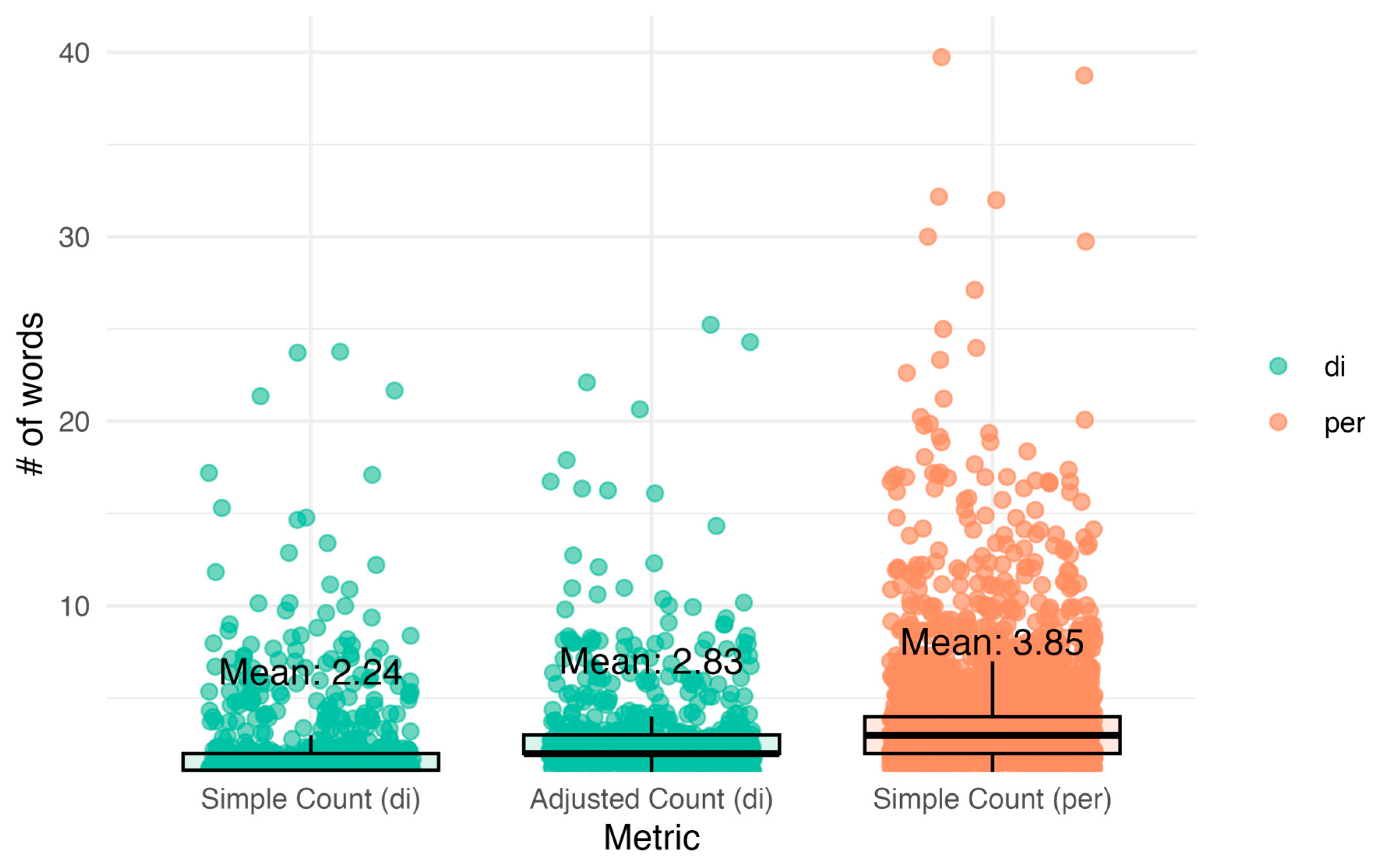 | 7 | Although compound infinitive complements are always at least two words, all three complement types showed appreciable variation in their length—nominal complements averaged 2.98 words (SD = 2.95, n = 2443), simple infinitives averaged 4.9 words (SD = 5.47, n = 68), and compound infinitives averaged 5.59 words (SD = 4.58, n = 489). Generalized variance inflation factor diagnostics (car package; Fox & Weisberg, 2019) indicated minimal collinearity between complement type and length (adjusted GVIFs < 1.1). |