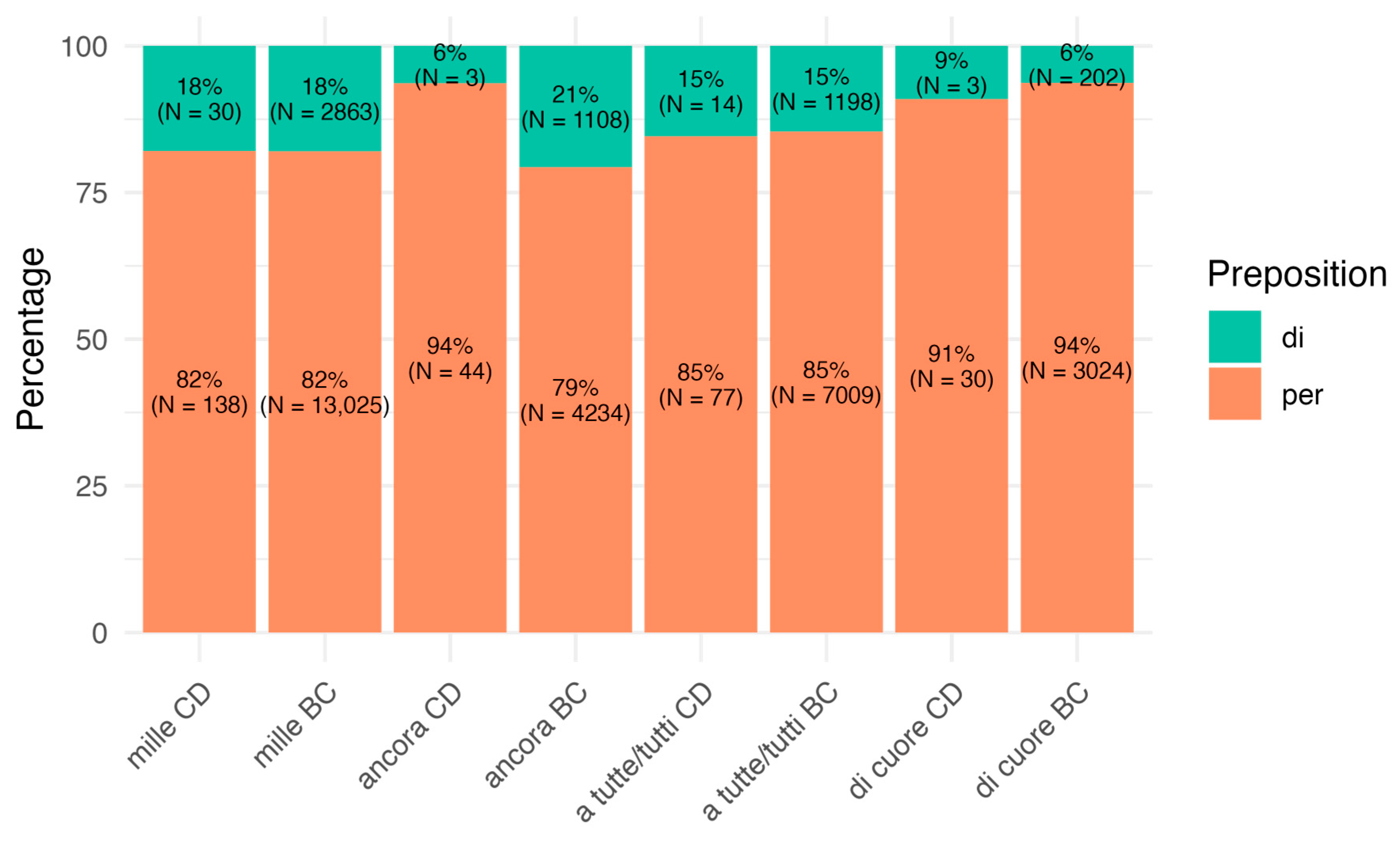 | 8 | It is possible that in the case of di cuore di/per tutto speakers avoid the close repetition of di, though this remains unexplored. |