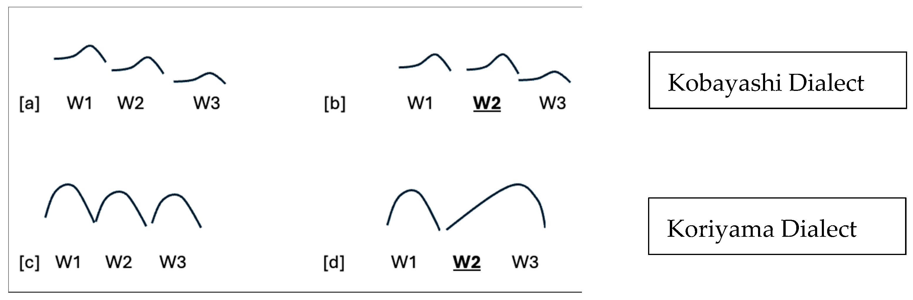 - Igarashi, Y. (2012). Prosodic typology in Japanese dialects from a cross-linguistic perspective. Lingua, 122(13), 1441–1453. [Google Scholar] [CrossRef]