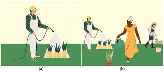 Example images of scope ambiguous stimuli: (a) Surface scope representation for the sentence ‘A person watered every plant’; (b) Inverse scope representation for the sentence ‘A person watered every plant’.