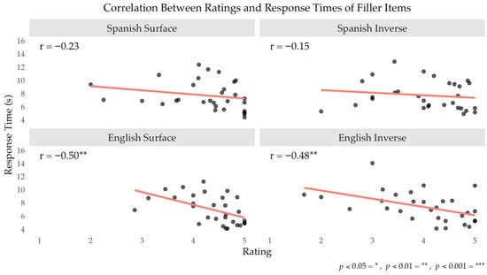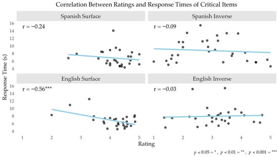 To compare response times across the Spanish and English groups, two-tailed, independent-sample t-tests assuming equal variances were conducted. Results revealed no significant differences in surface response times across the two languages, t(58) = 0.50, p = 0.622, with a negligible effect size (d = 0.13, 95% CI [−0.39, 0.65]). Nor were there significant differences in the inverse response times across language groups, t(58) = 1.32, p = 0.191, with a small effect size (d = 0.34, 95% CI [−0.18, 0.86]). These results (summarized in Table 5 and represented in Figure 3) suggest that inverse interpretations are associated with longer response times and no significant differences are observable across languages.