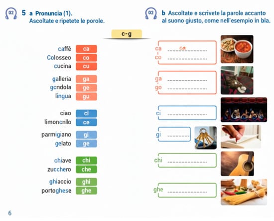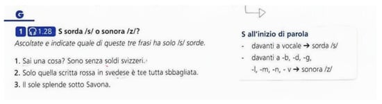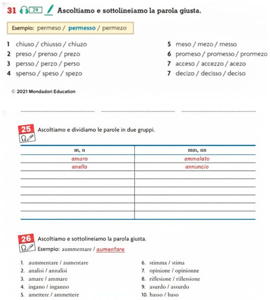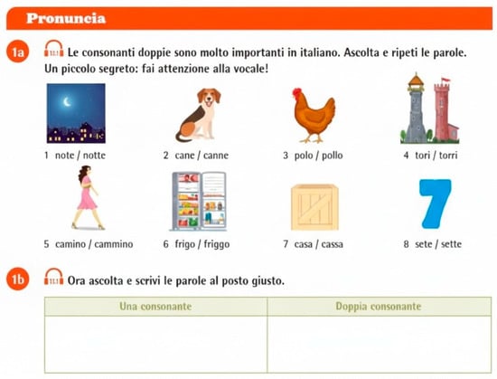 In 29 of the 32 texts, consonant duration is widely discussed; these textbooks propose listening exercises in which the students are asked to recognise whether certain sounds are singletons or geminates, sometimes also focusing their attention on the preceding vowel duration (see Figure 8 and Figure 9).