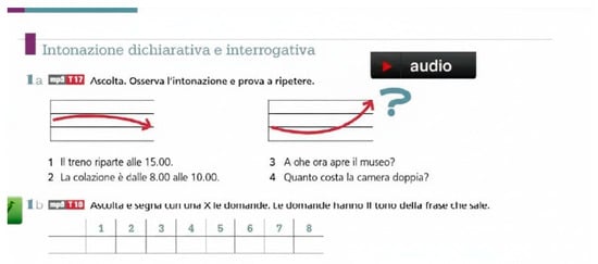 Conversely, as far as rhythm and intonation are concerned, the data show that only 6 of the 32 textbooks feature an intonation section. However, as shown in Figure 11, Figure 12 and Figure 13, they focus on the different intonation patterns that characterise declarative, interrogative, and exclamative sentences, with no reference to geographic variation.