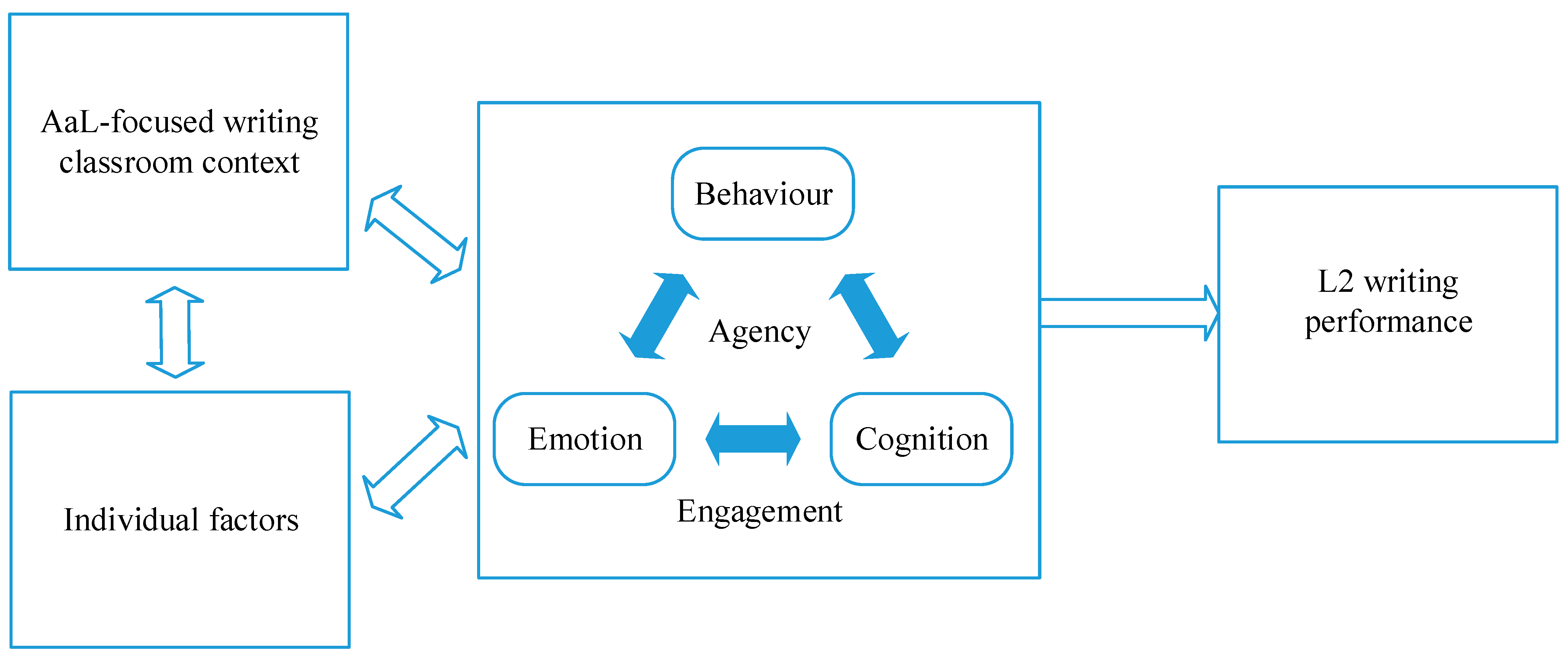 In L2 writing, AaL remains under-researched. Existing literature on AaL in L2 writing has mainly focused on writing teachers’ AaL practices (e.g., Lee et al., 2019; Wang et al., 2020), as well as teachers’ and students’ perceptions of the strengths and challenges of AaL (e.g., X. Xiang et al., 2022). Since students’ involvement with AaL is deemed to improve their self-regulation and help them grow into independent writers and key assessors (Lam, 2016), recent studies (e.g., Wang & Lee, 2021; Wang & Shen, 2025) have begun to examine AaL in L2 writing from the perspective of learner engagement, defined as the extent of a student’s active involvement in a learning activity (Reeve, 2013). Learner engagement was observed to have a positive association with learning outcomes, including language performance in writing and reading (Christenson et al., 2012). Given the crucial role of engagement in facilitating language learning (Mercer & Dörnyei, 2020), investigating engagement can offer insights into how AaL fosters students’ writing performance, i.e., learners’ ability to perform writing tasks (Hyland, 2003). Although limited prior research has investigated how learners engaged in L2 writing assessment (e.g., Wang & Lee, 2021; Wang & Shen, 2025; Zhang, 2020), little research has explored learner engagement as a process through which an AaL context relates to writing performance. Theoretically, understanding how learners engage with AaL and how their engagement may relate to their writing performance can provide insights into the complex process of L2 learning in classroom writing assessment.