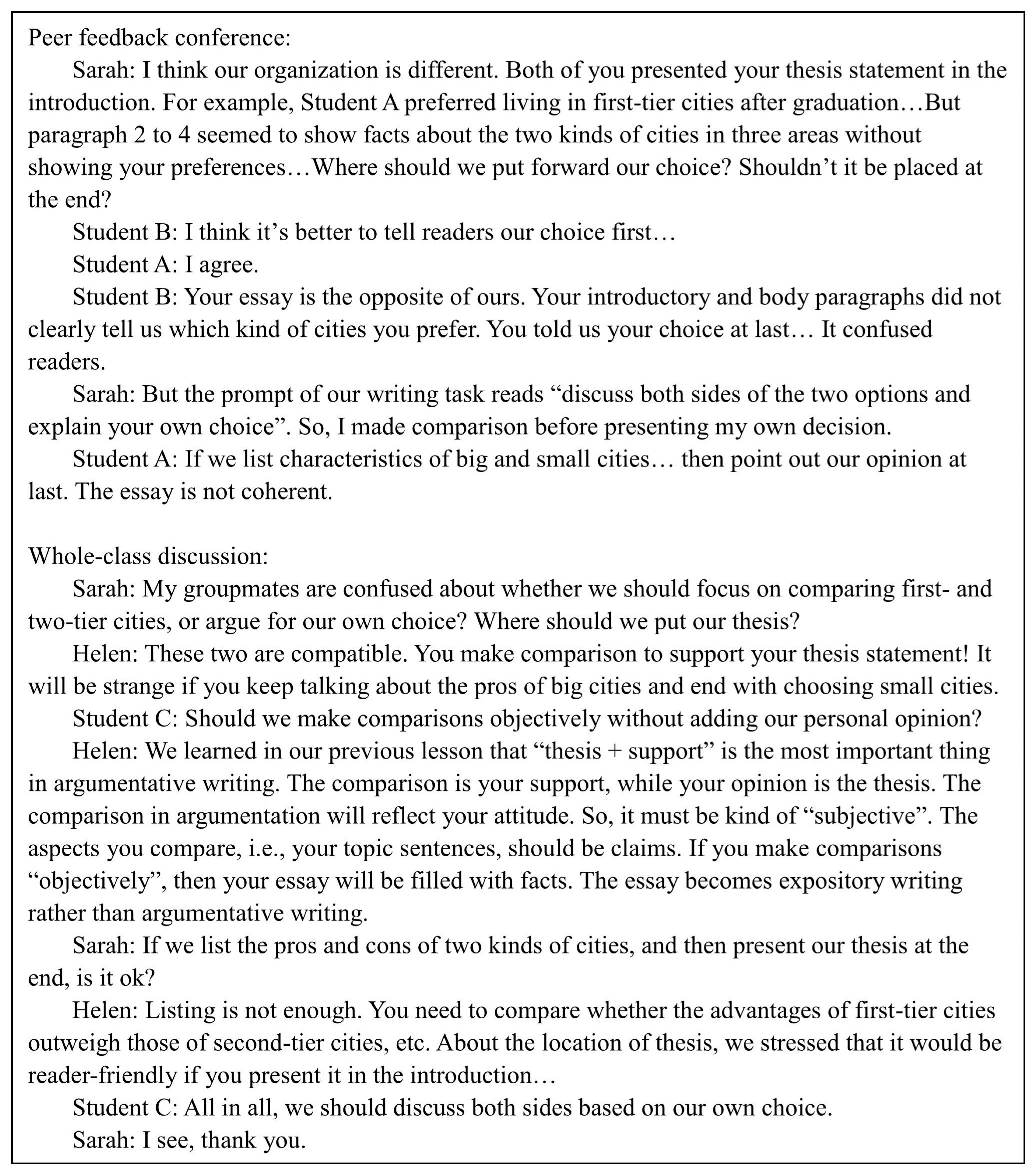 In addition, writing drafts and observation field notes revealed that Sarah’s commitment to dialogic feedback and her proactivity in adjusting writing goals aligned with higher writing performance in content and structure. Taking the location of the thesis statement and organization of main arguments in the two-sided argumentation as an example (see Figure 2), Sarah elicited relevant responses from peers and explained her thinking during the peer conference; when opinions among peers diverged, she solicited help from her teacher and the whole class to revise the structure and content of the essay: