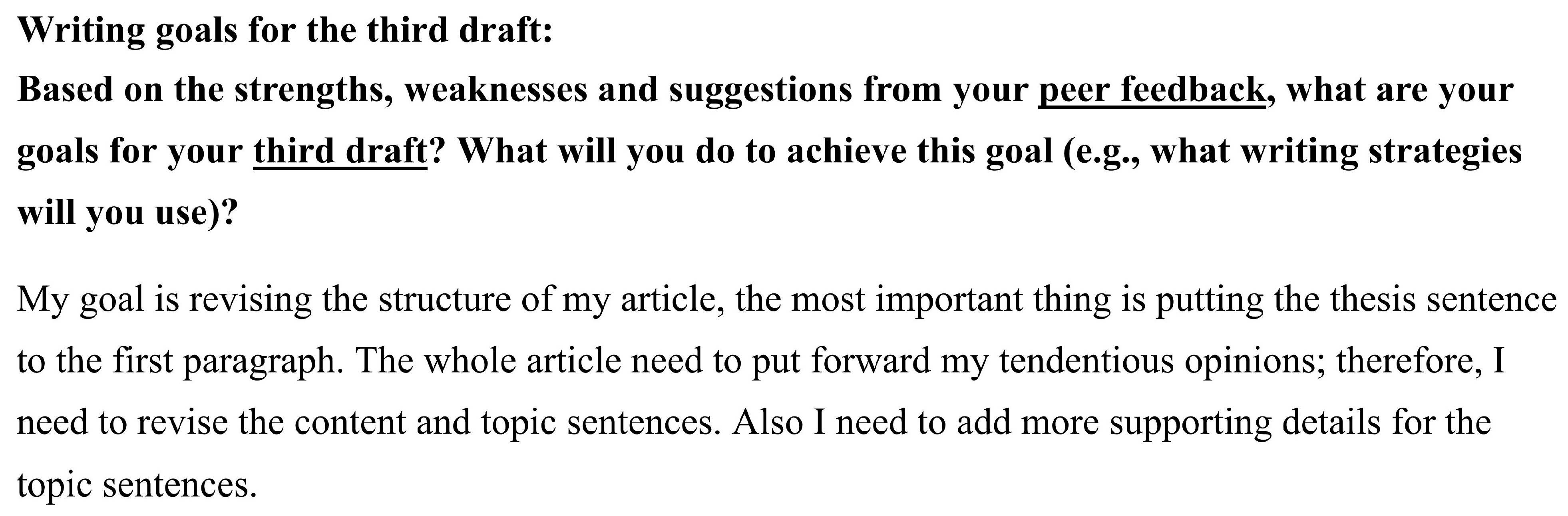 As Sarah agentively engaged in the feedback process, she came to realize that the purpose of two-sided argumentation is to “argue for my point of view through a comparison; if I wanted to argue that college students should live in first-tier cities, then the comparison of two kinds of cities should be aligned with my thesis statement” (post-study interview). With this understanding, Sarah further adjusted her goals for Draft 3 in her learning log (Figure 3) and thought aloud a concrete next step: “I decided to revise the overall structure. I will present the thesis statement first and then write a few arguments” (Think aloud protocol, Essay 1 Draft 3).