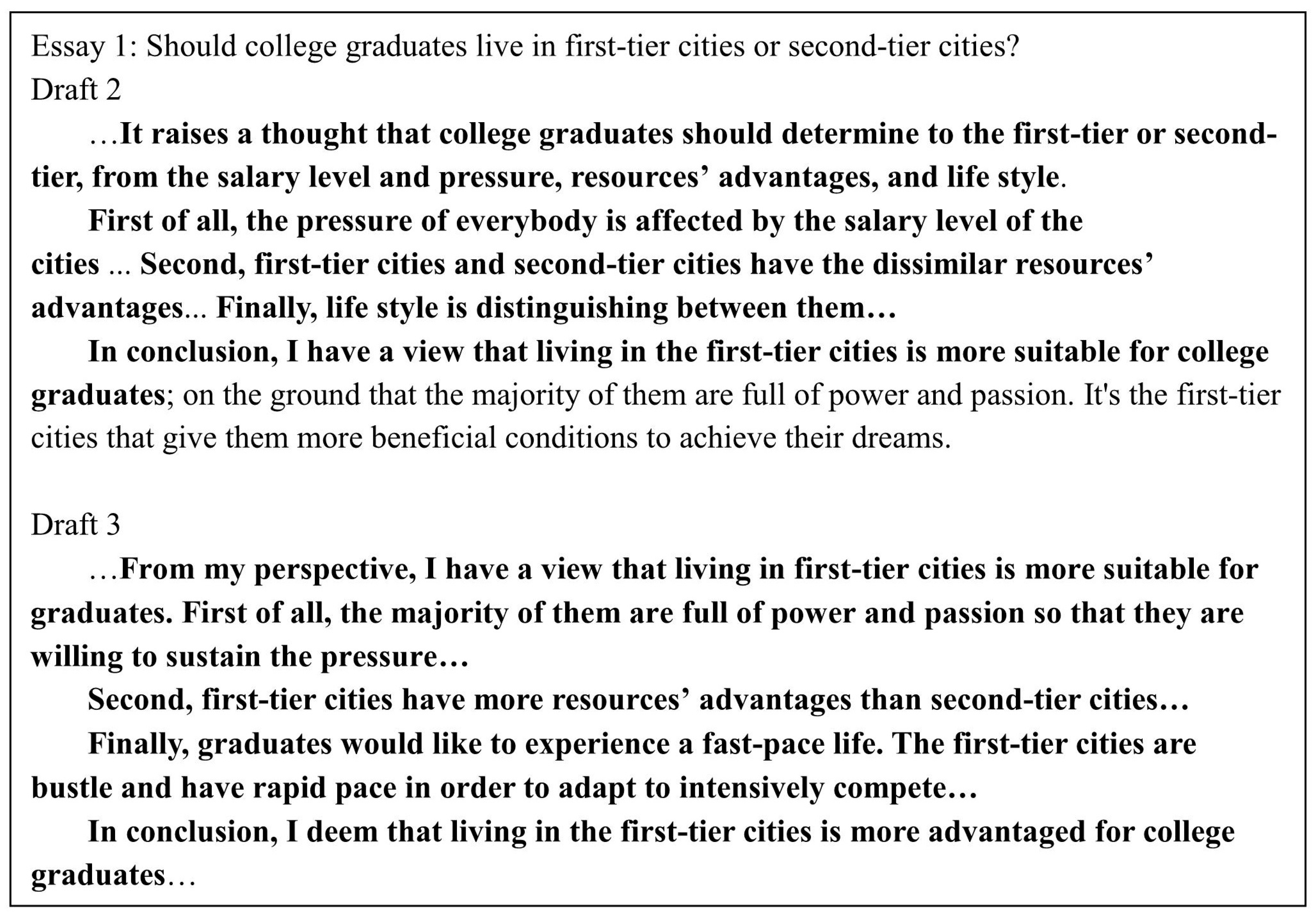 As a result, her third draft saw a clearer thesis statement at the beginning: “living in first-tier cities is more suitable for graduates”. In addition, three topic sentences were revised from factual comparisons of two kinds of cities (e.g., “first-tier cities and second-tier cities have dissimilar resources’ advantages”) to claims that big cities rather than small cities are better suited to graduates (e.g., first-tier cities have more advantages in resources than second-tier cities). As such, her Draft 3 (see Figure 4) saw an enhancement in composing main arguments that supported the thesis statement, which strengthened the relevance of the essay content: “I used to place topic sentences in different places, but now I begin each paragraph with a topic sentence. With topic sentences, I plan to write corresponding content in each paragraph, which increases the relevance of the essay content” (post-study interview).