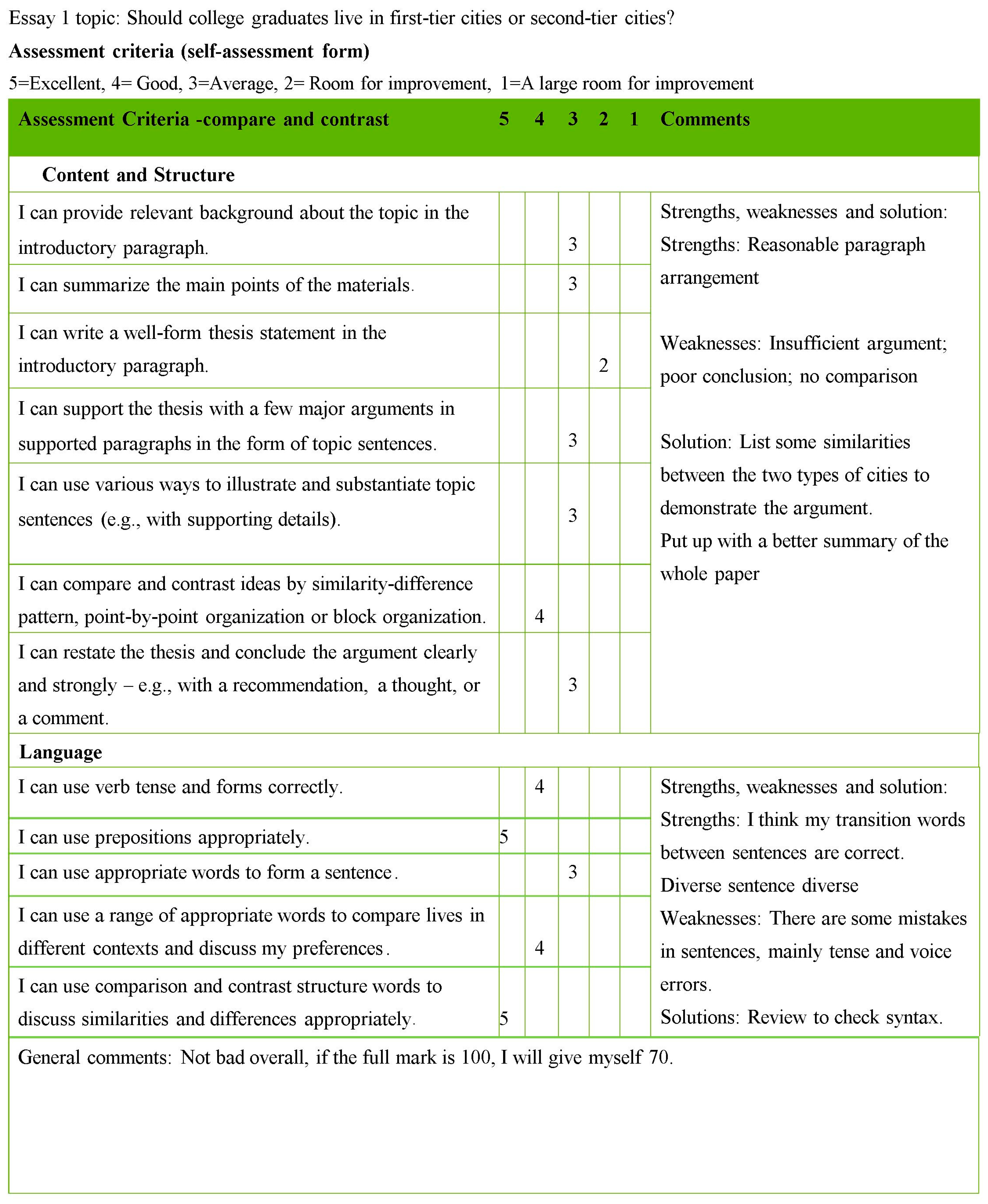 In addition to content and structure, Sarah progressed in vocabulary and sentence patterns: “I used to repeat simple connectives such as ‘first’ and ‘second’, but now I can use a wider range to meet different purposes” (post-study interview). Drafts and learning logs analyses revealed that the increased richness of vocabulary and sentence patterns was associated with Sarah’s proactive involvement in self-assessment, goal-adjusting, and self-initiated revisions of lexical choices, connectives, and sentence patterns. For instance, Sarah self-assessed her Draft 1 of Essay 1 and identified her weakness: “the words are not abundant” and planned to “enhance the variety of words” (self-assessment form). When revising for Draft 2, Sarah expanded her vocabulary range by using synonyms, e.g., replacing “more and more” with “an increasing number of”; she also diversified her sentence patterns by applying newly learned comparison and contrast structure words such as “nevertheless,” “on the other hand,” “while,” and “unlike” to discuss similarities and differences between big and small cities.