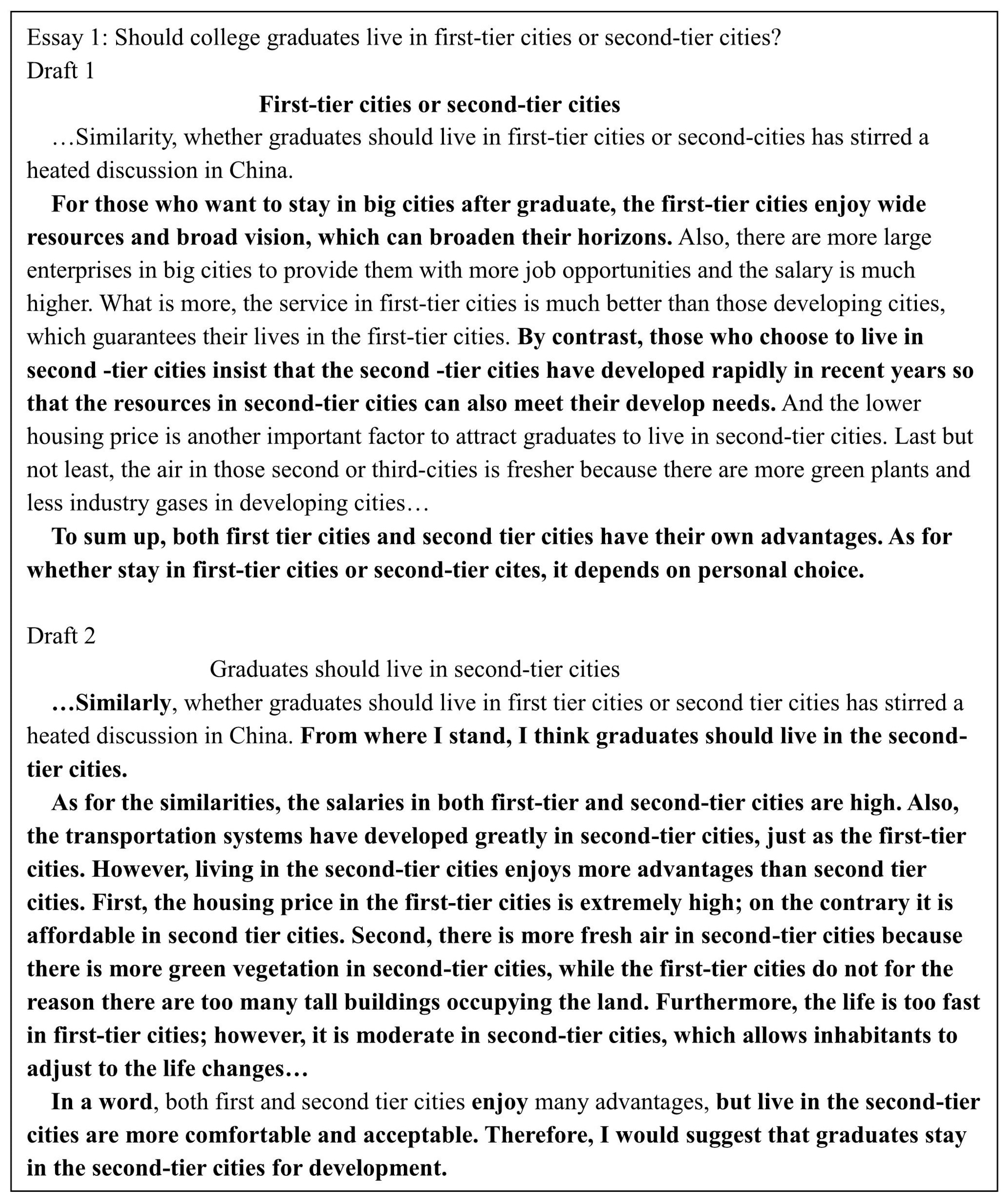 Analyses of writing drafts and verbal reports in Essay 1 demonstrated Anne’s performance in content and organization was also boosted by her proactivity in goal-adjusting and self-initiated meaning-focused revisions. Based on self-assessment results that Draft 1 lacked a thesis statement at the beginning, a comparison of both sides in the body, and a summary of arguments at the end (Figure 6), Anne adjusted her goals for Draft 2: “I read the topic ‘Should graduates live in first-tier or second-tier cities’ again and thought there should be a clear thesis. I chose ‘living in the second-tier cities’ as my thesis statement… Therefore, I need to emphasize the advantages of second-tier cities and deemphasize the pros of first-tier cities to support my thesis” (stimulated recall). As a result of her goal adjustment and self-initiated revisions throughout the essay, Draft 2 showed improved performance in writing a clear thesis statement in the introduction (“From where I stand, I think graduates should live in the second-tier cities”), in using comparison and contrast to support her argument that “living in the second-tier cities enjoys more advantages than second-tier cities”, and in replacing an ambiguous statement “it depends on personal choice” with a restatement of her thesis that “I would suggest that graduates stay in the second-tier cities for development” in the conclusion (see Figure 7).