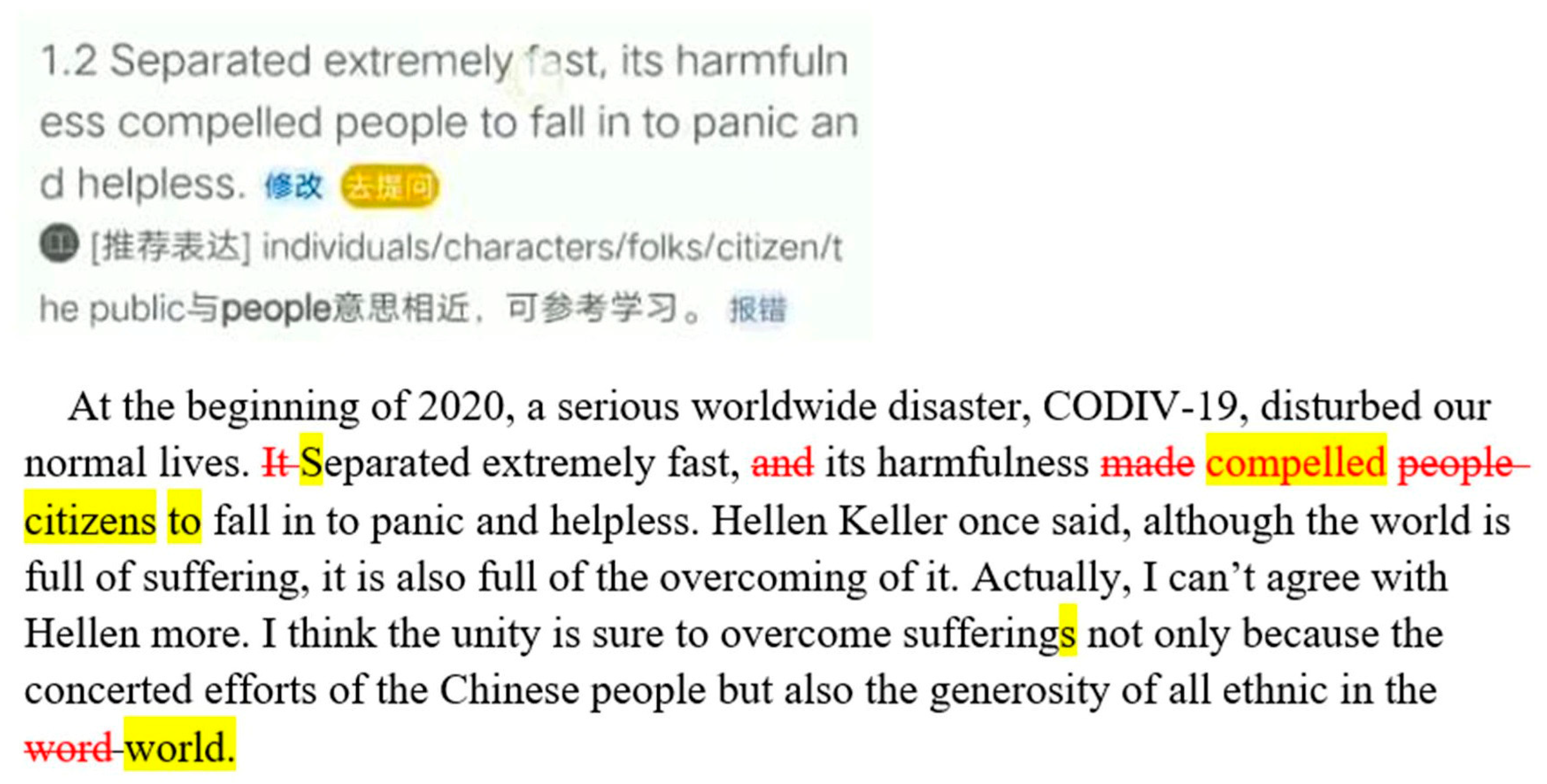 At the while-writing stage, students were trained to self-assess draft 1 using feedback forms (adapted from Lee, 2017). Helen usually provided instructional scaffolding on other language points, such as introducing approaches to enhance vocabulary richness, sentence variety, and guiding students to proofread common grammatical errors. Online tools such as Pigai (an AWE system available institutionally) and Thesaurus were also introduced to encourage students to independently check for language accuracy and diversify lexical choices. Based on self-assessment results and newly learned language points, students were asked to revise for Draft 2.