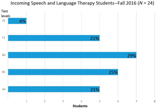 As can be seen, the placement test confirmed a range of competency levels from A2 to C2, with 21% (5/24) of the class below the B1 level. Students were immediately advised of their placement test results, with the weakest in effect put on notice that they would have to make a serious effort if they hoped to succeed in the course. This required the demonstration of at least a B1 level of competence by the end of the first semester and B2 by the end of the second semester.