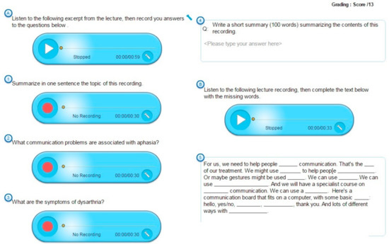 The use of Schoolshape complemented that of Google+, giving students the opportunity to practise academic and English language usage on their own, thus greatly extending time on the task out of class. Schoolshape activities supported and reinforced the acquisition of disciplinary course content and technical vocabulary as well as listening comprehension, reading, writing and speaking skills. Lectures given by members of the academic staff and visiting professionals were audio recorded and then re-edited to extract passages, of one to two minutes’ duration, that lent themselves best to linguistic exploitation. These were used in conjunction with screen shots of accompanying PowerPoint (Microsoft Corporation, Redmond, WA, USA) presentations to provide visual support for listening comprehension exercises. Brief video clips and short readings from external sources relating to lecture topics were likewise used to supplement course content and language exposure. Using Schoolshape, these resources formed the basis of a considerable variety of activity types, i.e., multiple-choice, text gap-fill, labeled images, open-ended text responses, audio responses, audio gap-fill, and webcam video recording (Figure 3). As with Google+ resources, these were accessible to students without the need for (or expense of) on-campus language labs or technical support infrastructure.