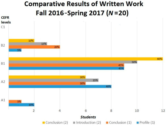 The comparison of student writing was undertaken on the basis of four pieces of work, two from the first semester and two from the second semester. The first semester samples consisted of a student profile done at the beginning of classes and the conclusion statement of the e-portfolio submitted at the end of the first semester. The second semester samples consisted of the introduction and conclusion of the e-portfolio submitted at the end of the course. In their first semester 150–200 word profile, students introduced themselves and explained why they had chosen to major in Speech and Language Therapy at the Cyprus University of Technology. In the introduction of their second semester e-portfolio, they wrote a 150–200 word description of their e-portfolio contents. In the e-portfolio conclusions of both semesters, students wrote a 300-word summary about what they had done during the course and what they thought they had learned from it, from their own work, that of their group members, and the rest of the class. All four written assignments were assessed according to CEFR ”Can Do” criteria. Due to discontinuations between the first and second semesters and missing assignments, results are based on a total of 20 students.