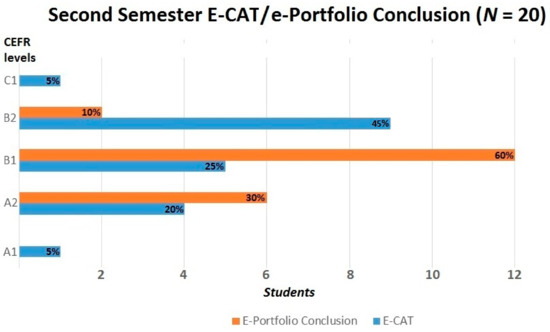 Lastly, in comparing the CEFR rankings of the 20 students who took both the E-CAT and submitted an e-portfolio conclusion in the second semester (Figure 7), it can be seen that the overall distribution of CEFR levels in both cases manifests approximately the same bell shape, with a peak at B1 for the e-portfolio conclusion and B2 for the E-CAT. The number of students ranked below B1 level in both the e-portfolio conclusion and the E-CAT is more or less the same, reaching 30% and 25% respectively. As noted previously, the e-portfolio conclusions contain no students at A1 level. The most important difference, however, can be observed in the number of students who scored above B1 level. Specifically, nine students (45%) were rated at B2 and one (5%) at C1 in the second semester E-CAT, while only 2 (10%) were placed at B2 and none at C1 in the e-portfolio conclusion. Most likely, this was due to the fact that the E-CAT was a quantitative assessment measure, dealing primarily with receptive reading and listening comprehension, while the e-portfolio conclusion focused on productive writing, which is a different and more difficult skill to master.