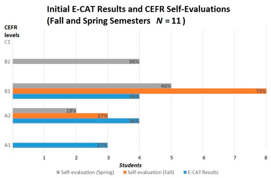 At the end of the Fall 2016 and Spring 2017 semesters, students were asked to self-evaluate the CEFR level at which they would rate themselves. To do this, they were given an online document, which included all CEFR descriptors and levels that described the activities of each block in each of the two semesters. Instructors distributed and explained these activities and the corresponding CEFR descriptors to the students at the beginning of each block, in order to raise their metacognitive awareness (see Section 4). For the purposes of the present analysis, only the self-evaluations of students which the E-CAT initially placed below B2 were taken into consideration since this was the targeted output level of the two-semester sequence. For this reason, and because not all students completed the assignment, only eleven self-evaluations were examined. In order to analyse this data, each CEFR level was given points from one to five, with A1 = 1 and C1 = 5. For each general CEFR descriptor, the highest self-rating was noted, added to the other general descriptors and then divided by the overall number of descriptors. Depending on the average result, the students were then rated at the CEFR level according to the points assigned.