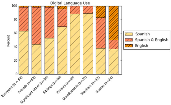 Finally, to better understand what domains of students’ lives are conducted in each language, students estimated how many people they communicate with primarily in Spanish, English, or a mixture of both languages. The purpose of this question was to determine what areas of their life are conducted in English rather than the actual amount of Spanish, English, or Spanglish they use. On average, students reported that they use only English with 24.5% (n = 19, SD = 0.394) of the groups of people in their life. Teachers and bosses accounted for the majority of these individuals, with friends and significant others making up the remainder. Figure 1 illustrates the responses to this question. Students reported that they primarily used Spanish with siblings, parents, and grandparents, that they mixed languages with friends and significant others, and they used English with teachers and bosses. There is a clear trend here to use Spanish with family members (siblings, parents, and grandparents), echoing previous work that finds that the language of respect at home among Spanish-speaking families in the United States is usually Spanish, whereas the language of respect at school and work is usually English [38].
