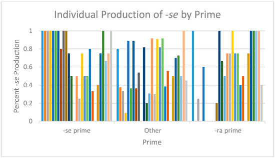 Figure 2 shows how these priming effects played out for each individual participant.7 While some tendencies, such as the greater number of categorical productions of -se when presented with a -se prime, are evident in the image, the most notable result is the great variability in production rates across participants. Thus, in comparison to the overall acceptance of both forms which is remarkably uniform across all participants, production shows great idiosyncratic variability.