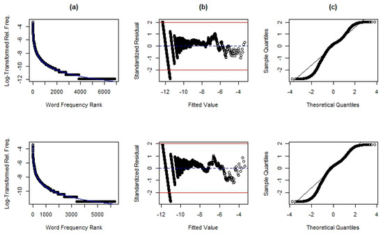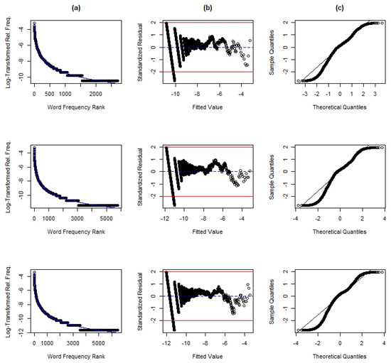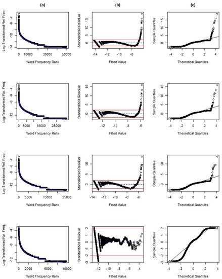 64] is obtained by taking the square root of the sum of the squared residual errors over all observation values and dividing the result by the degrees of freedom for the model. The last metric provided, COR(y, ŷ), represents the correlation of the log-transformed relative frequency values with their corresponding fitted values. We would like to point out that SE is not the critical indicator of fit for the power laws considered here. The AIC and BIC are more robust indicators of model fit. We note that the corpora were handled in un-lemmatized form.