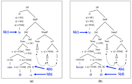 (a) Syntactic structure for the unmixed Spanish determiner phrase (DP) la casa ‘the house’; (b) Syntactic structure for the mixed Spanish–English DP la house ‘the house’. Numbers indicated by arrows show which insertion rules apply in the given syntactic context.