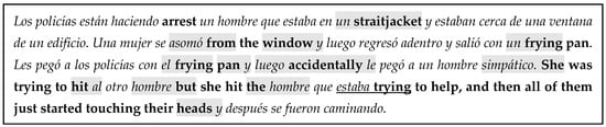 Codeswitched narrative produced by a Spanish-English bilingual during the film description task in (; used with author’s permission). Spanish is italicized; English is emboldened; estar + English participle codeswitches are underlined and other codeswitches are highlighted. Translation: The police were arresting a man that was in a straitjacket and they were near a window in a building. A woman peaked out from the window and then returned inside and came out with a frying pan. She hit the police with the frying pan and later accidentally hit the nice man. She was trying to hit the other man, but she hit the man that was trying to help and then all of them just started touching their heads and afterward they left walking.