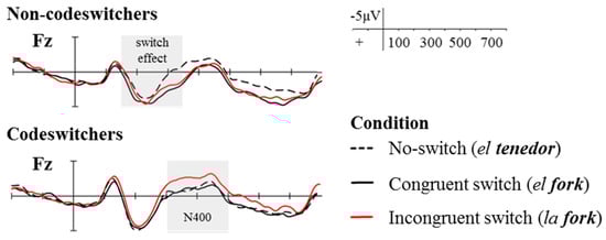 () use ERPs to examine the grammatical gender asymmetry of mixed NPs in two groups of bilinguals who differed in codeswitching experience (codeswitchers and non-codeswitchers; see description in Section 3.1). Participants were asked to read short stories that contained different types of codeswitches while their electrophysiological data were recorded. The goal of the study was to test whether bilinguals’ electrophysiological responses to the mixed NP asymmetry differed as a function of codeswitching experience. In their design, () compared the processing of different types of mixed NPs (congruent gender switch vs. incongruent gender switch) as well as the processing of mixed NPs relative to unilingual noun phrases (switch vs. no-switch) across the two groups of participants. As depicted in Figure 5, codeswitched conditions elicited a frontal positive deflection in the ERP waveform peaking between 200–300 ms for non-codeswitchers but not for codeswitchers. What this suggests is that for non-codeswitching bilinguals, reading codeswitched stimuli requires a greater allocation of cognitive resources. For switch vs. switch comparisons, codeswitchers demonstrated N400 sensitivity to congruency manipulations, suggesting that masculine targets in incongruent noun phrases (i.e., la fork) were more difficult to integrate relative to masculine targets in congruent noun phrases (i.e., el fork). Importantly, codeswitches that adhered to participants’ usage patterns found in the codeswitching map task did not result in switching costs in the ERP experiment. Overall, the study provides converging evidence that individuals are highly sensitive to the variation in their language experience, addressing the need for accounting for the linguistic repertoire of speakers in the interpretation of lab-based results. The findings demonstrate how switching costs largely depend not only on the type of codeswitch but also the bilingual’s language experience.