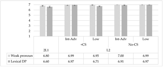 There were also three other central differences between the studies. First, Giancaspro included a 2L1 bilingual group as a direct comparison, and he had participants complete an aural AJT, instead of written. Additionally, unlike Toribio’s participants, all of the L2 speakers in Giancaspro’s study were enrolled in upper-level, undergraduate Spanish classes. Proficiency was instead determined using a modified version of the Diplomas de Español como Lengua Extranjera (DELE, Certificate of Spanish as a Foreign Language)1 (Montrul and Slabakova 2003).