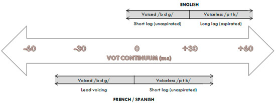 When Lisker and Abramson (1964, p. 422) coined the term VOT, they defined it as “the time interval that marks the release [of the stop] and the onset of periodicity that reflects laryngeal vibration [for vowel production]”. Voice onset time is the most commonly used phonetic measure of phonemic voicing in pre-vocalic stops. Of interest to this study, VOT production for voiceless stops is similar in Spanish and French, on the one hand, and different in English, on the other. When placed along a VOT continuum, Spanish and French voiceless stops are expected to fall within the 0 to 30 ms range associated with short lag (as per Cho and Ladefoged’s 1999 definition of voiceless unaspirated stops). In contrast, typical VOT values for their English counterparts are greater than 30 ms and often fall within a 60–100 ms range (Lisker and Abramson 1964), occupying the extreme end of the continuum labeled as long lag, as depicted in Figure 1.