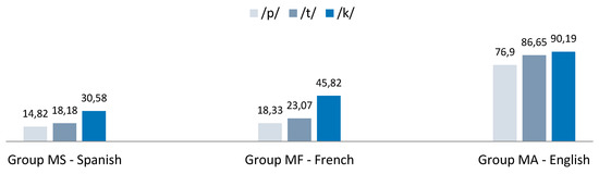 The Spanish word list yielded a total of 270 tokens for analysis from Group MS. Their means per stop are /p/ = 14.82 ms, /t/ = 18.18 ms, /k/ = 30.58 ms. The 270 tokens obtained from Group MF yielded the following means per target stop: 18.33 ms for /p/, 23.07 ms for /t/, and 45.82 ms for /k/. Lastly, after discarding two tokens (due to mispronunciation), the 142 tokens analyzed from Group MA resulted in the following means: 76.9 ms for /p/, 86.65 ms for /t/, and 90.19 ms for /k/. All means from the three control groups, portrayed in Figure 2, will be used as a baseline to determine the extent to which the L2 and the L3 values have been acquired, and the L1 values maintained.