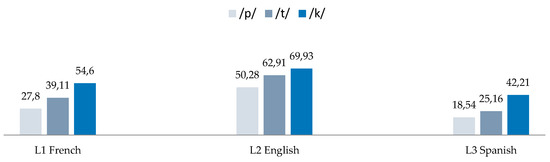 Mean VOT (ms) in the voiceless stops of Group TF in L1 French, L2 English and L3 Spanish.