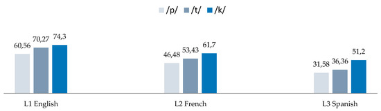 In sum, regarding L3 Spanish, a complex picture of acquisition emerges from these findings, which reveal different production patterns for each stop. To better answer our research question, however, it is necessary to examine the overall patterns observed, rather than concentrate only in Spanish. For ease of comparison across the three languages between the two experimental groups, we provide a summary of the results obtained in Table 3.