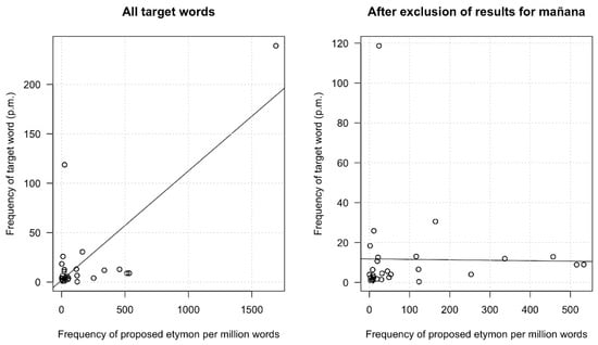 Since (a) I aimed at including both usage frequency of target words and usage frequency of proposed etymon as predictor variables in a logistic regression analysis, and (b) it is a prerequisite for logistic regression analyses that the predictor variables be independent from each other, I eliminated the results for the target word mañana from the analysis. This procedure also eliminated the correlation between the two predictor variables in the data (see the right plot in Figure 1). I therefore did not eliminate the results for the target word prensa, which also has a high usage frequency (118.7 p.m.), from the data. See Figure A1 in the Appendix for an overview of the frequencies of acceptance for each of the target words.