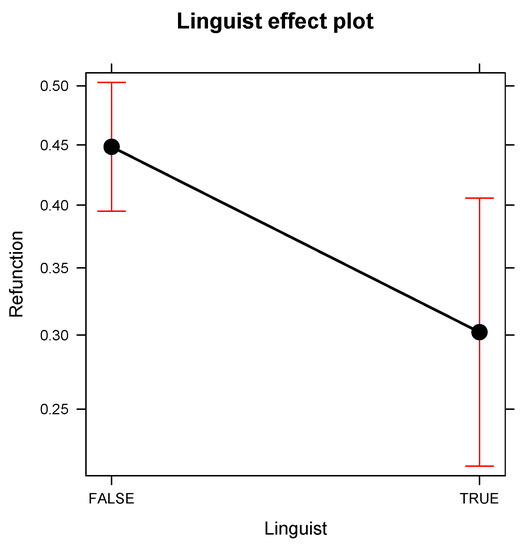 Of the social indicators, only the variable Linguist had a significant effect on the participants’ choices. Age and Sex appeared to be irrelevant. As illustrated in the effect plot (Figure 2), participants with a knowledge of linguistics were significantly more skeptical regarding the proposed etymologies.