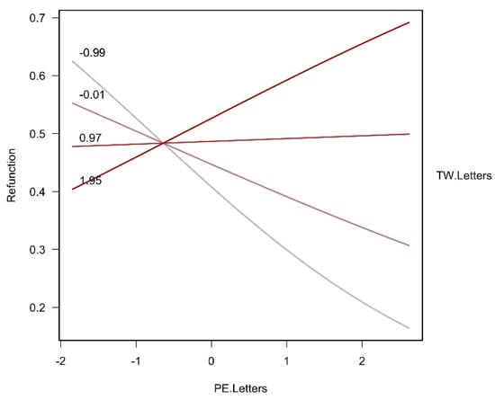 Furthermore, the analysis demonstrated the existence of an interaction effect between the two word-length indicators. Figure 4 illustrates this moderating effect of TW.Letters on PE.Letters. The finding that shorter proposed etymons are judged to be better etymons was restricted to cases in which the target word was also short (the lines marked as −0.99 and −0.01). If the target word was long (the lines marked as 0.97 and 1.95), the effect was reversed; participants were more likely to accept longer proposed etymons than shorter proposed etymons.