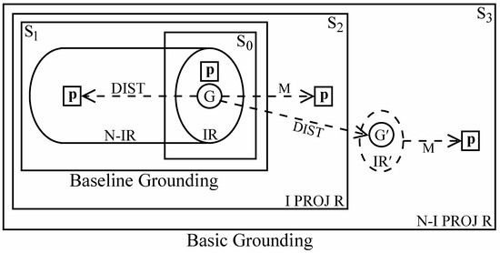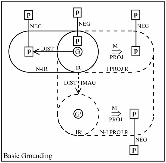The basic modals (M) elaborate the baseline grounding system as shown in Figure 2a. They afford a wider range of options, allowing both real occurrences and those whose realization can be projected (with varying degrees of confidence). In contrast to baseline grounding, where p is limited to R, a modal specifically removes it from R. Reality is still at issue since the modal projection envisages p as part of an updated reality conception. We can therefore recognize a higher, more inclusive level of reality that encompasses not only baseline reality (R) but also projected reality (PROJ R). At this higher stratum reality comprises both the established course of events and the projected course of events.