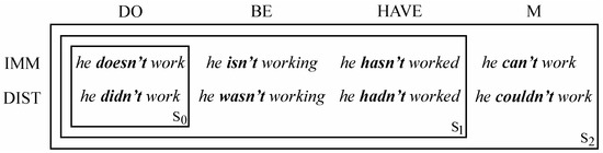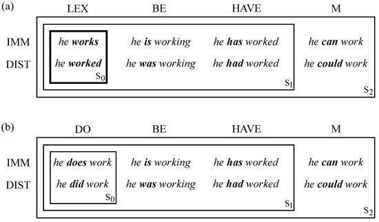 In Figure 4, I summarize the basic options for the finite verb in an English clause. The finite verb is given in bold, with he work as the type of occurrence, and can representing the modals. In 4(a), the simplest case, S0, is that of a baseline clause, where the finite verb is just the lexical verb (LEX). The other two strata correspond to basic clauses. At S1, involving perspectival constructions, the finite verb is be or have. At S2 a modal (M) serves in this capacity. Figure 4a,b are the same apart from S0, where do replaces work as the finite verb. This constitutes an elaboration, since do adds another level of formal and conceptual complexity (e.g., he does work instead of just he works). But it also simplifies matters in that Figure 4b represents a neat paradigm exhibiting a basic regularity: in each case the finite verb is highly schematic. Within Figure 4b, S0 is still the initial stratum, since do is conceptually simpler than be, have, or M, which incorporate aspectual, perspectival, or modal import.